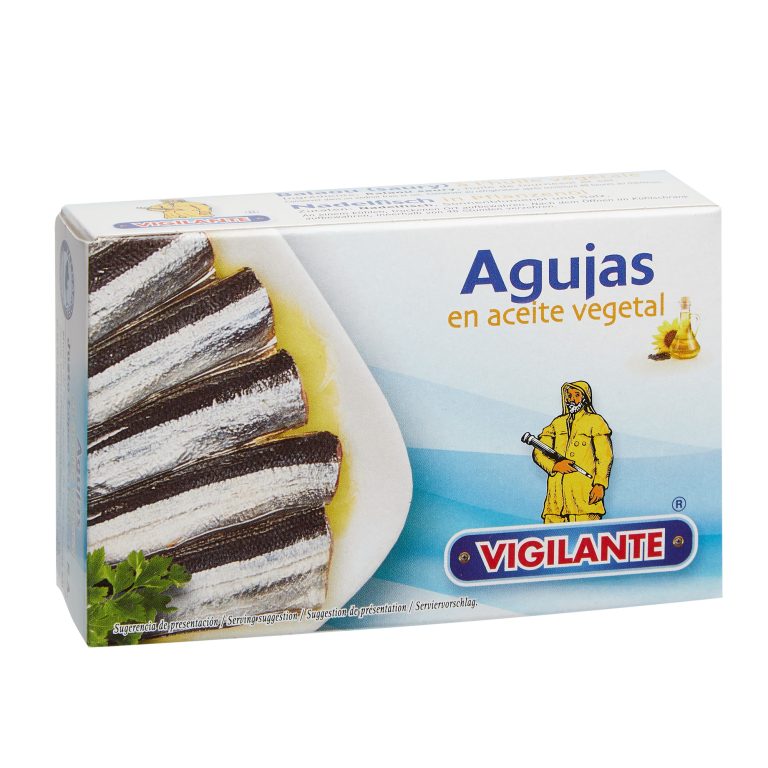 La aguja es muy particular dentro de la conserva tradicional Gallega, no sólo por su sinuoso aspecto con la cabeza terminada en forma de aguja y forma alargada, sino también por su sabor intenso y su carne densa. Este pescado nutre a la vez que satisface los paladares más genuinos con su intenso sabor a mar.